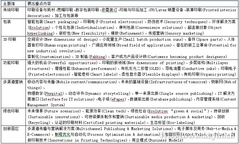 而Drupa展場單位經(jīng)過三次的產(chǎn)業(yè)調(diào)查報告,提出產(chǎn)業(yè)發(fā)展的六大亮點主題(Highlights),包括傳統(tǒng)印刷(Print)、包裝(Packaging)、3D印刷、功能印刷(Function Printing)、多渠道營銷(Multichannel)、綠色印刷(Green Printing)等展館,還有特別展區(qū)包括創(chuàng)新園區(qū)(Innovation Park) 、觸摸包裝、專題演講、設(shè)計、電子印刷與解決方案、3D印刷等館,提供參訪者對展場有較重點性的信息掌握,這些館的展示內(nèi)容如下: