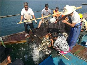 下午二點(diǎn),采風(fēng)團(tuán)來(lái)到金竹牌起魚碼頭,深入了解了淳牌有機(jī)魚起魚作業(yè)的全過(guò)程。接著,大家一起來(lái)到千島湖魚博物館,該館負(fù)責(zé)人親自擔(dān)任解說(shuō)員,帶領(lǐng)我們參觀學(xué)習(xí)了豐富的魚文化。